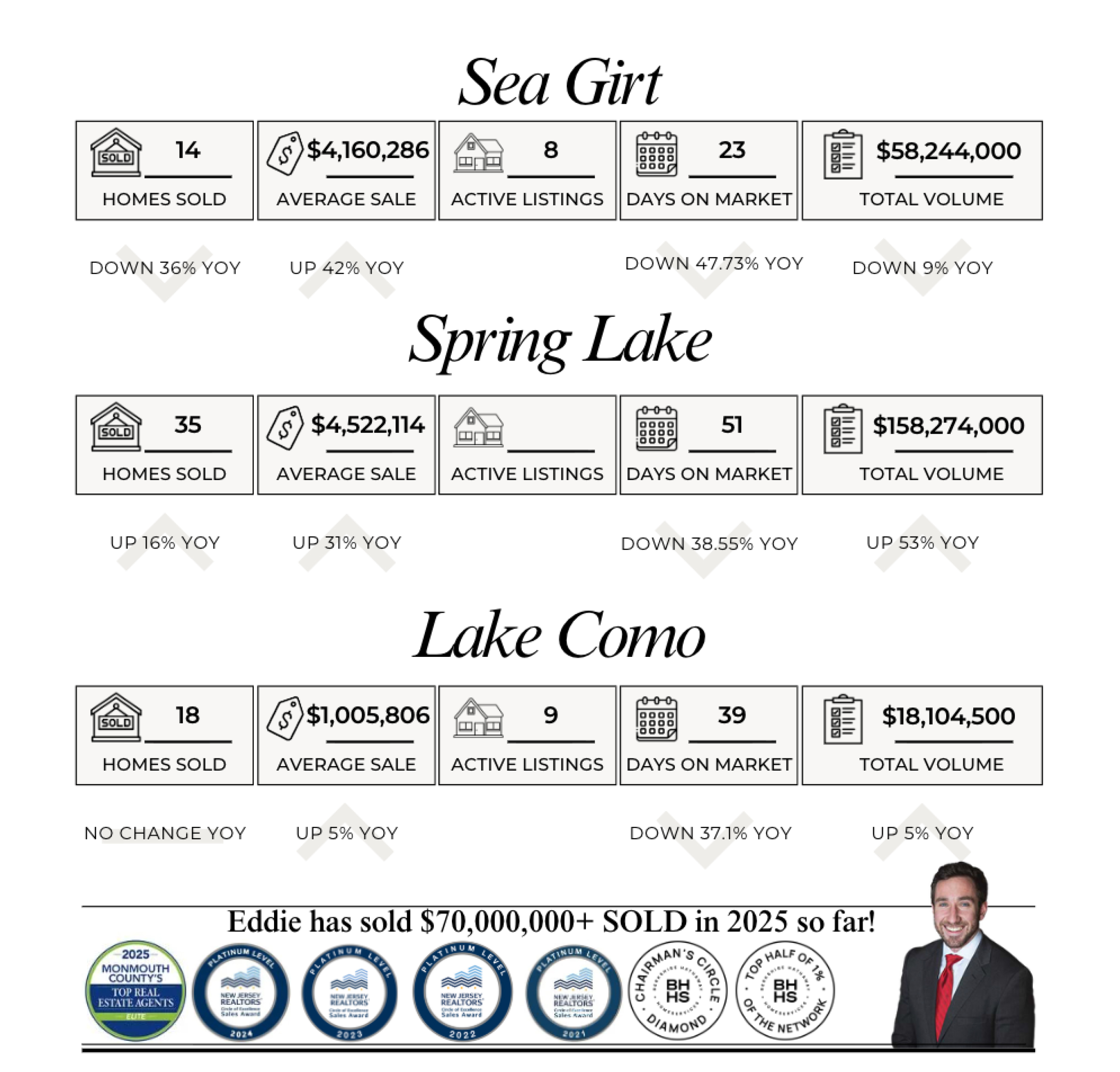 The Shore market remains strong as we head into the holiday season. I’ve compiled market statistics on the following pages to highlight year-over-year comparisons for nearby towns. If you’d like to review additional areas, feel free to reach out or visit my website. In the upcoming months and in 2026 there are several key trends to watch. These include the Netflix development, NYC buyer demand. Also to watch are the interest rates changing to levels that may unlock some inventory from homeowners experiencing the “locked-in effect” with their current low mortgage rates.