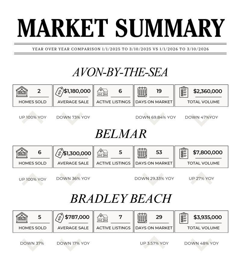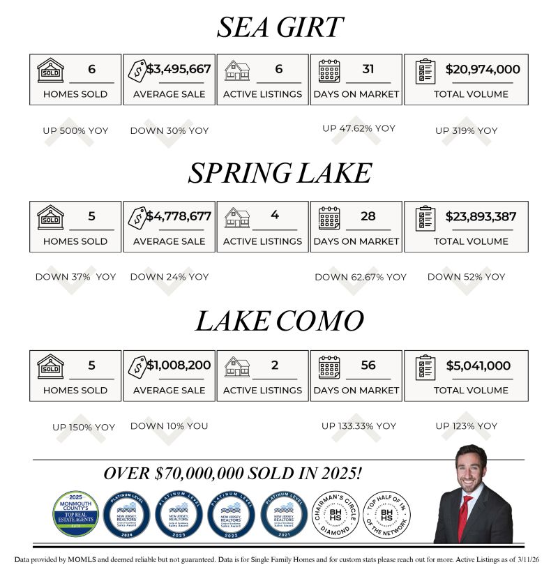 New listings to kick off 2026 were down in all towns* except Sea Girt which was up 50%. Avon (-16%), Belmar (-20%), Bradley Beach (-46%), Spring Lake (-38%), & Lake Como (-62%). Bidding wars are heating up and seeing multiple over asking offers on many recent listings this March.